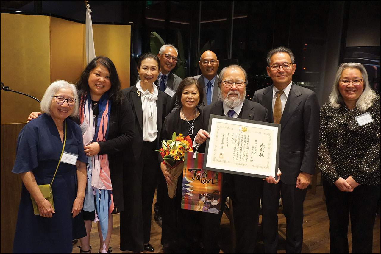 (Cover) Yuko Iyori, Consul General Makoto Iyori, Steve Sumida holding commendation certificate and his wife, Gail M. Nomura holding the flowers that were presented to Steve.