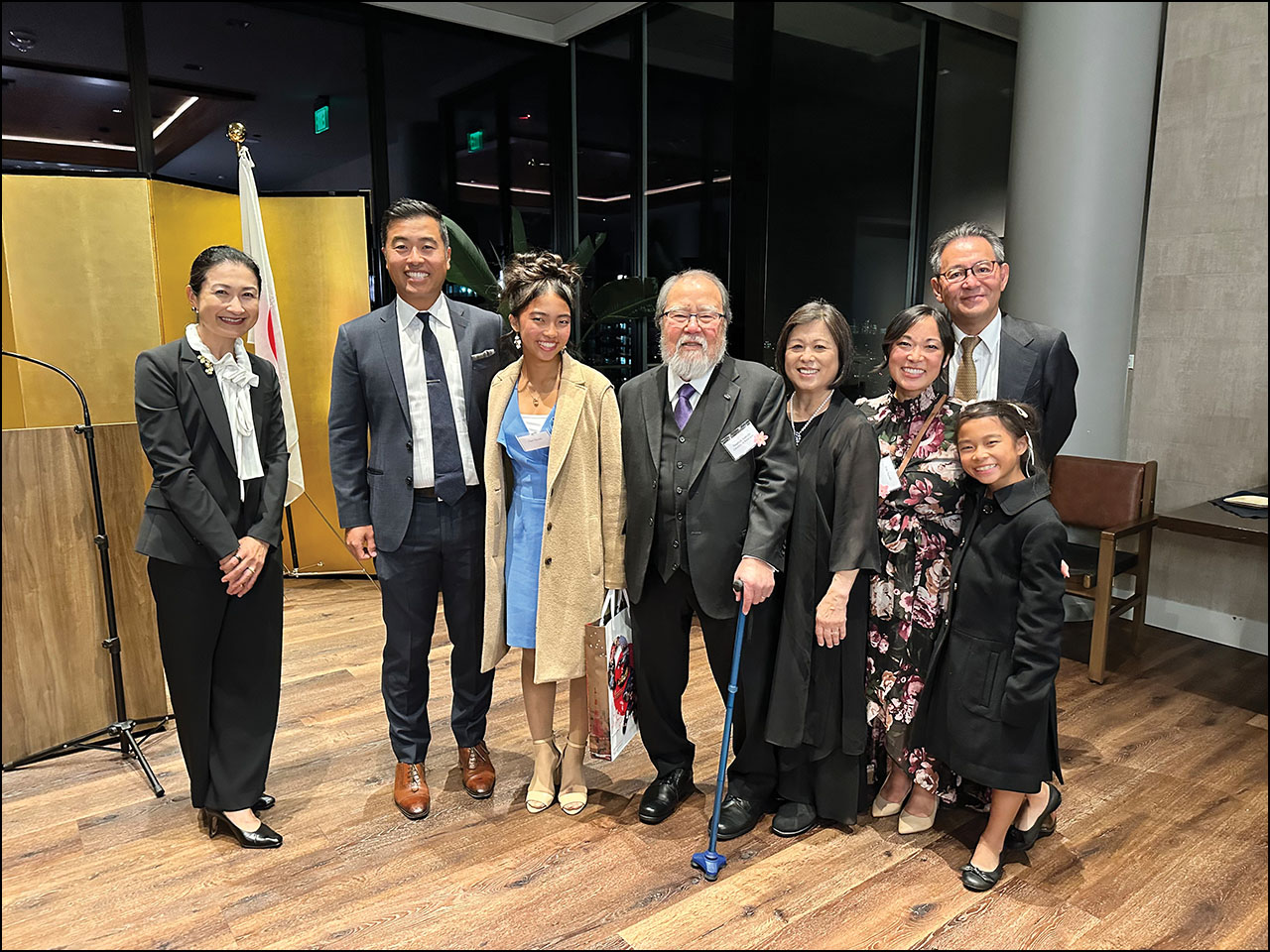 (First slide) Kathy Onishi, Rev. Karen Yokota Love, Yuko Iyori, Eugene Onishi, Gail Nomura, Ron Nobuyama, Steve Sumida, Yuko Iyori, Consul General Makoto Iyori, and Yuki Sofronas celebrate together. (Second slide) Yuko Iyori, son-in-law Kyle Suzuki, granddaughter Clare Suzuki, Steve Sumida, wife Gail Nomura, daughter Emi Suzuki, granddaughter Alice Suzuki, and Consul General Makoto Iyor.