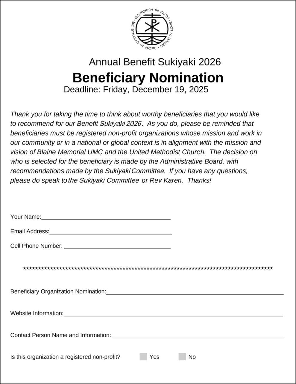 Do you know of any organization or cause that would be worthy of supporting in 2026? Download above the Sukiyaki 2026 Beneficiary Form and let us know who Blaine Memorial UMC can provide a lift this spring.