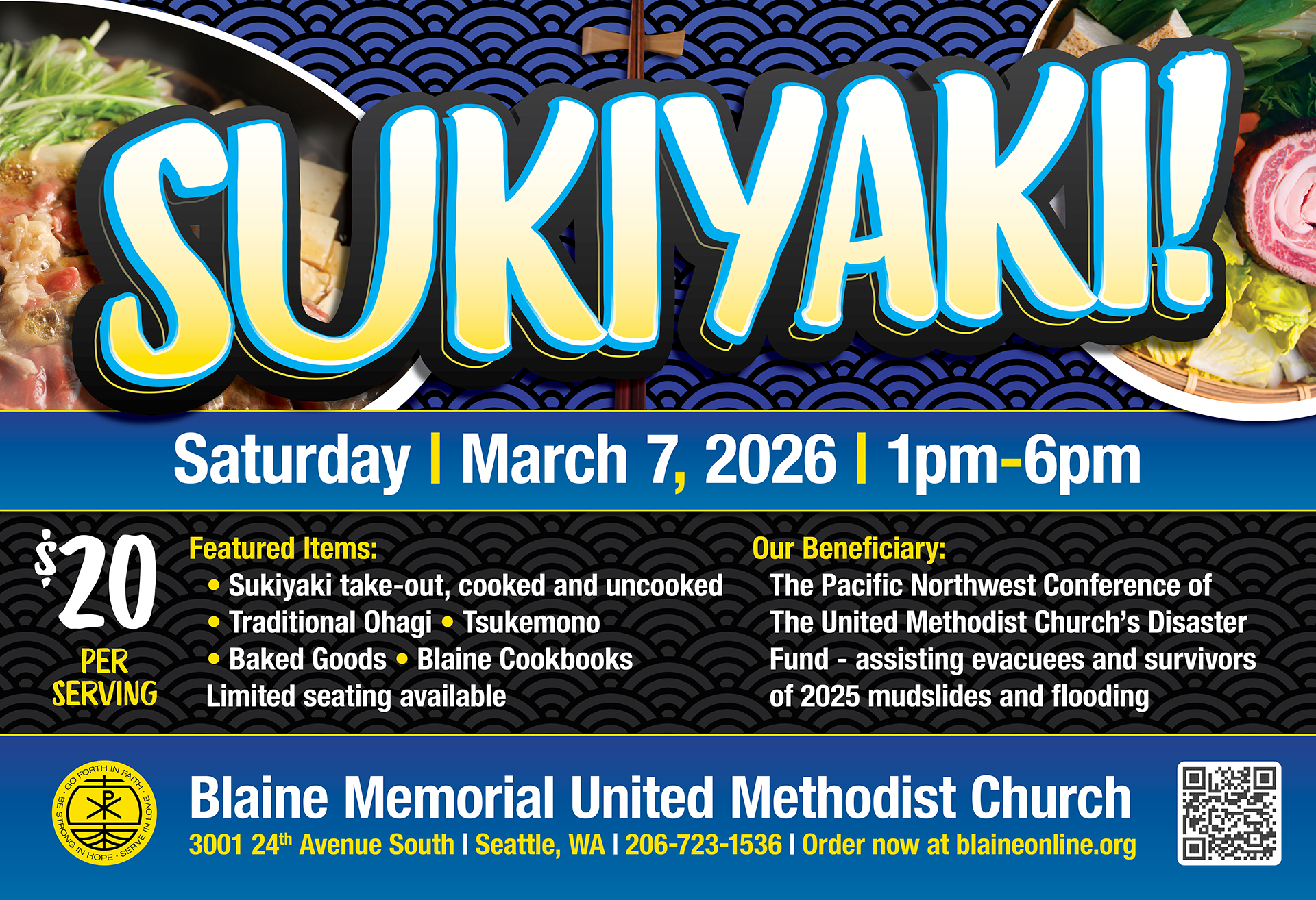 Blaine Memorial’s Sukiyaki Benefit Fundraiser is back! Mark your calendars and SAVE THE DATE for SATURDAY, MARCH 7, 2026! Our beneficiary will support The Pacific Northwest Conference’s Disaster Fund.